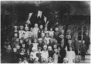 Podpis zdjęcia w Kronice: Pierwsze w Sadownem przedszkole tzw. OCHRONKA, założone staraniem Koła Polskiej Macierzy Szkolnej około r. 1914. Na fotografii grupa przedszkolaków sadowieńskich przed Ochronką podczas obchodu rocznicy Konstytucji 3-Maja 1917 r. Z lewej strony na dole, przysłonięta igliwiem świerkowym zasłużona dla tej placówki i szczerze jej oddana nauczycielka p. ZOFIA KONOPNICKA. Na udekorowanej jedliną i biało-czerwonymi chorągiewkami ścianie budynku widnieje ORZEŁ BIAŁY pokazany w Sadownem publicznie po raz pierwszy po długiej niewoli zaborczej.