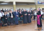W Gminnej Hali Sportowej już też nie mogli doczekać się na swoje spotkanie z bpem Pikusem gimnazjaliści i uczniowie naszych średnich szkół. W końcu przybył i do nich i otrzymał owacje na stojąco, a w roli gospodarzy tym razem byli wspólnie Dyrektorzy: Pan Sławomir Ryszawa i Pani Małgorzata Zyśk. I jeszcze jedno – 13 października obchodzony jest w Gimnazjum Dzień Patrona, którym jest błogosławiony Edward Grzymała. Stąd cała oprawa uroczystości, prezentacja multimedialna „Śladami księdza Edwarda” Pana Sławomira Akonoma o Patronie Szkoły, ale też piękne tańce szkolnego zespołu tanecznego ZSP, który prowadzi Pani Mirosława Renik. Przy tej okazji nastąpiło też podsumowanie całej wizyty Duszpasterza w naszej Parafii, jakże doniosłej i ważnej dla nas – parafian.