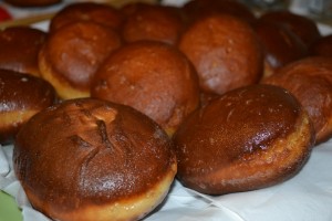 – z wyrośniętego ciasta formujemy pączki (aby ciasto nie przyklejało się do palców, można umoczyć palce w ciepłym smalcu) – do środka wkładamy marmoladę (najlepiej różaną) – i odstawiamy do wyrośnięcia. Pączki przykrywamy ściereczkami, a nawet lekkim kocykiem.