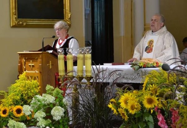 Wieńce dożynkowe i ich asysty, po powitaniu na „progu” świątyni przez proboszcza parafii ks. Antoniego Kunickiego, wprowadzili do kościoła Starostowie Dożynek – Państwo Monika i Waldemar Kędzierscy z Kołodziąża.