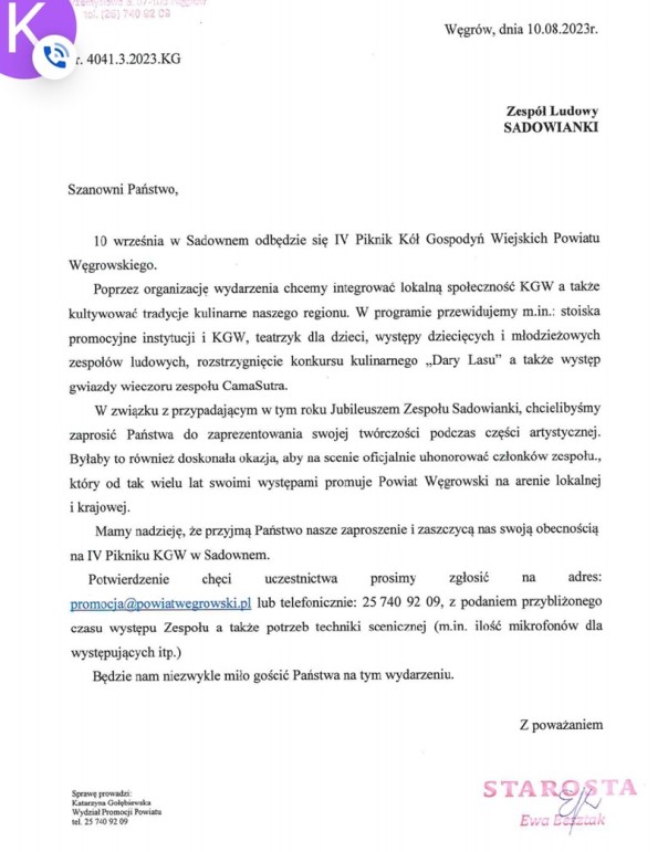 Zaproszenie dla Zespołu Śpiewaczego Sadowianki na IV Piknik Kół Gospodyń Wiejskich powiatu Węgrowskiego, od Pani Ewy Besztak /Starosty Powiatu Węgrowskiego/