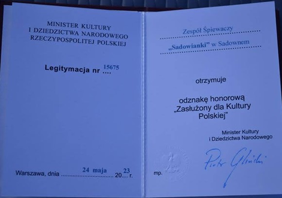 P. Starosta Ewa Besztak, w imieniu Ministra Kultury i Dziedzictwa Narodowego Rzeczypospolitej Polskiej p. Piotra Glińskiego, przekazała na ręce kierowniczki Zespołu p. Krystyny Wetoszki odznakę honorową „Zasłużony dla kultury polskiej”.