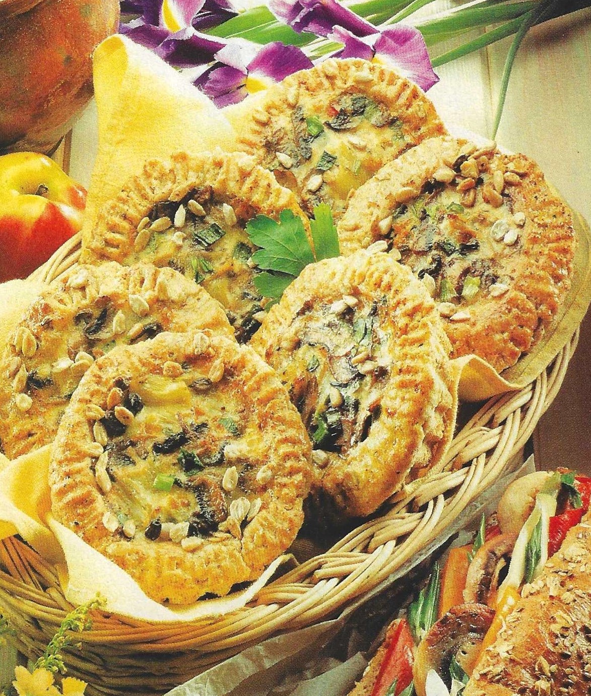Wymieszać dwa rodzaje mąki i otręby pszenne. Wkruszyć drożdże, dodać pół łyżeczki soli i olej, wlać ¾ szklanki ciepłej wody i wyrobić elastyczne ciasto. Ciasto odstawić na godzinę do wyrośnięcia. Grzyby pokroić na kawałki, opłukać, namoczyć, ugotować, dokładnie osączyć. Żółty ser zetrzeć na tarce z małymi oczkami. Pora oczyścić, opłukać, pokroić w krążki. Jajka rozkłócić z mlekiem, wymieszać ze startym serem, przyprawić łagodną Vegetą. Ciasto podzielić na kawałki, rozwałkować na niewielkie placuszki, uformować wyższy brzeg. We wgłębieniu ułożyć kawałki grzybów i pora, całość zalać masą jajeczną, posypać pestkami słonecznika. Chlebki ułożyć na natłuszczonej blasze, piec ok. 30 minut w 220 st. C.