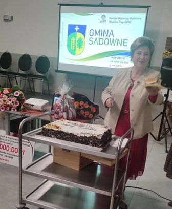 Zespół „Sadowianki” przygotował specjalny program, w którym przedstawiona została kariera zawodowa pani Marszałek. Następnie wraz z życzeniami wybrane osoby wręczyły bukiety kwiatów pani Elżbiecie i p. Wójtowi za ten wspaniały tandem, jaki stworzyli do współpracy.