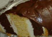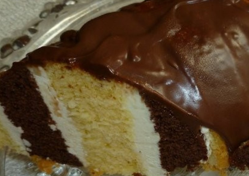 Ciasto: wodę zagotuj z cukrem i ostudź. Stopniowo dodawaj mąkę, żółtka, olej, proszek do pieczenia, a na końcu pianę ubitą z białek. Ciasto podziel na 2 części, do jednej dodaj kakao, dobrze wymieszaj. Wlej do 2 jednakowych wąskich blaszek(wysypanych bułką tartą), wstaw do piekarnika i piecz ok. 35 minut w temperaturze 180 st. C.