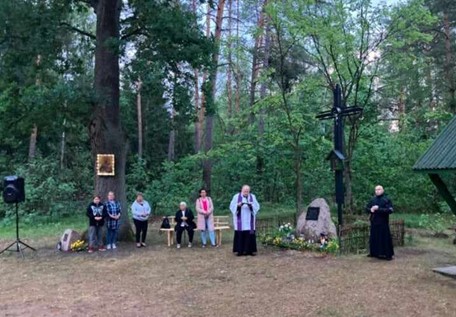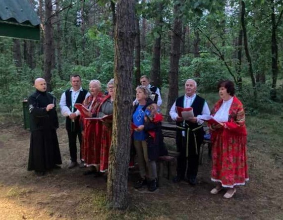 W środowy wieczór 29 maja 24 r. na tej leśnej polance zgromadzili się księża parafii Sadowne, służba liturgiczna, strażacy OSP z Sadownego oraz parafianie. Nabożeństwo modlitewne rozpoczęło się o godz. 20.30 pieśnią maryjną ,,Chwalcie łąki umajone” w wykonaniu Zespołu SADOWIANKI.
