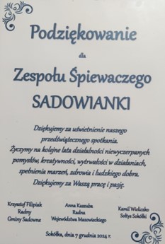 Tak ciężko o tym pisać, ponieważ delegacja „Sadowianek”, w dniu 9 listopada wybierała się po nagrodę za udział we wspomnianym przeglądzie seniorów w Węgrowie, a tu nagle przyszła bardzo smutna wiadomość o odejściu Tereski. Nie mogła nawet ucieszyć się przyznaną zespołowi nagrodą, do zdobycia której też się przyczyniła.