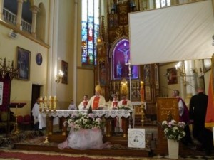 W uroczystej Mszy św. wzięli udział: zaproszeni goście, władze samorządowe, mieszkańcy oraz dzieci i młodzież z sadowieńskich szkół. Ks. Biskup wygłosił homilię, w której odniósł się do poczucia tożsamości lokalnej i narodowej. Mówił o konieczności odczuwania wdzięczności przez kolejne pokolenia dla przodków, którzy z wielkim trudem zagospodarowywali przestrzeń wokół siebie, budowali kulturę, tworzyli tradycję. Tylko społeczności odczuwające wdzięczność są w stanie istnieć i przekazywać następcom dorobek przeszłości. Do trwania potrzeba jest trudu kolejnych pokoleń, zaangażowania i nierzadko daniny krwi.