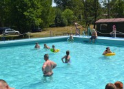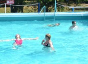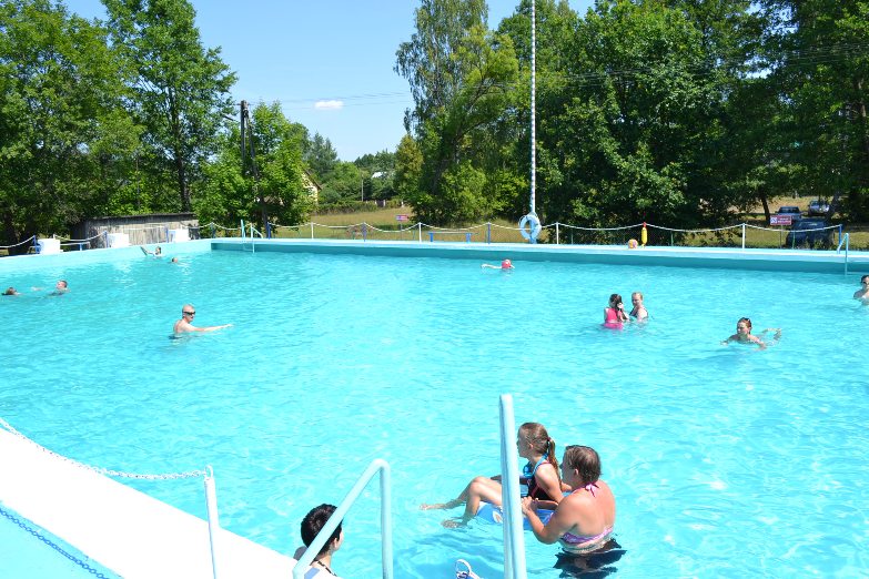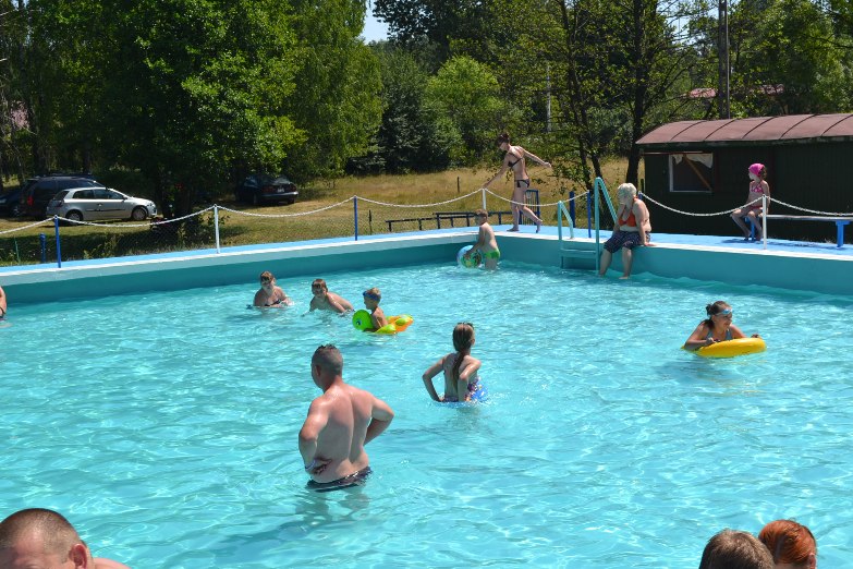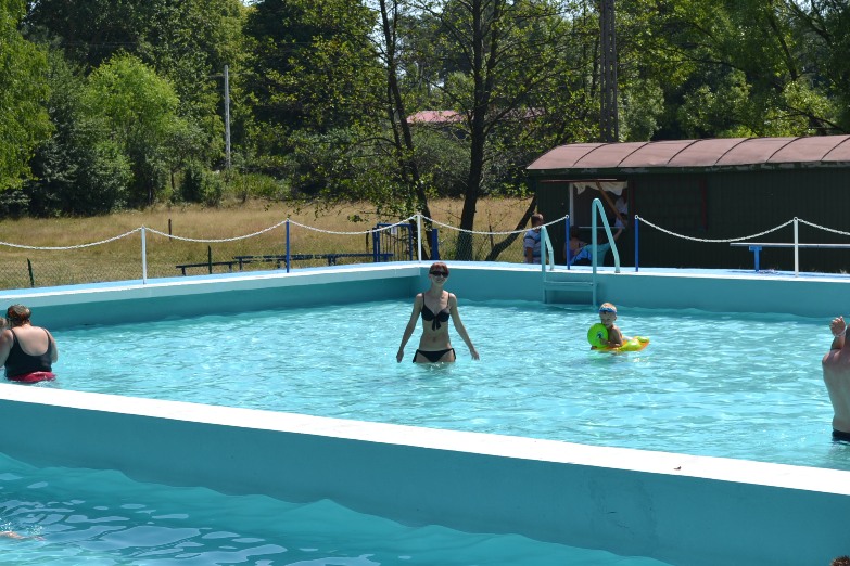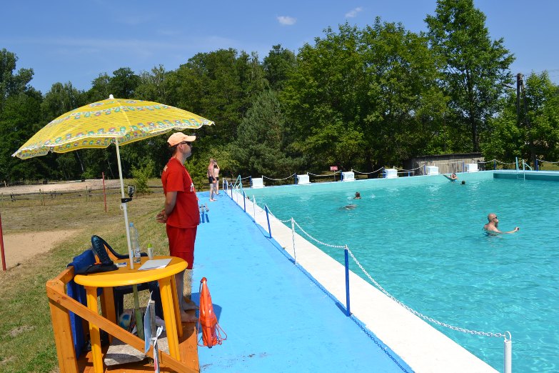 – Tylko najbardziej zahartowani pojawili się rano i w taki upał na basenie – informuje p. Adam Choromański, ratownik sadowieńskiego basenu kąpielowego. – Jedyne w okolicy takie kąpielisko powoli się zapełnia, woda jest ciepła i czysta. Na zasadzie odwzorowania dnia wczorajszego, wkrótce basen będzie „pękał w szwach” od miłośników zabaw wodnych – dodaje, jednocześnie monitorując całą długość tafli wody.