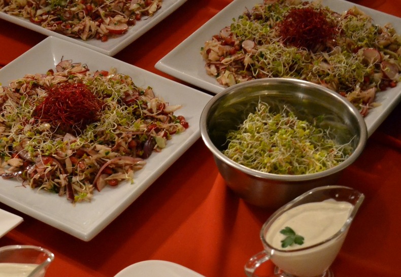 400 g kapusty białej, 1 pęczek rzodkiewki, 30 g kiełków rzodkiewki, 20 g kiełków buraka, ½ pęczka natki pietruszki, 1 czerwona cebula, 1 granat, 2 łyżki oleju rzepakowego, 2 łyżki octu z białego wina, ½ łyżeczki cukru, sól i pieprz do smaku