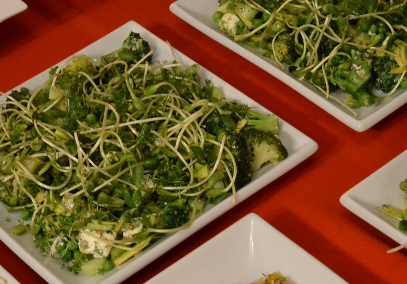 Brokuł ugotuj na parze, wystudź, groszek zalej wrzątkiem, odstaw na 4 min., odcedź, wystudź. Przełóż do miski, dodaj pokrojone ogórki bez pestek, kawałki awokado, kiełki i pestki słonecznika oraz pokrojony w kostkę lub pokruszony ser, polej sosem z oliwy i soku z cytryny, oprósz pieprzem, posyp rzeżuchą.