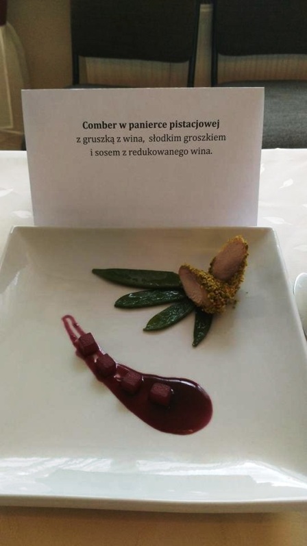 I miejsce – Hubert Rudnik i Kamil Puchta – Comber w panierce pistacjowej, z gruszką z wina, słodkim groszkiem i sosem z wina redukowanego.