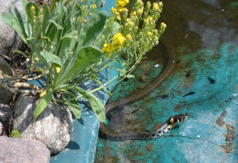 Musimy przygotować się też na pewne niespodzianki. Bliskość dzikiego terenu, woda, łatwy do zdobycia pokarm, to niechybnie pokusa… Nagle może zaskoczyć nas obecność przedstawiciela z rodziny wężowatych. Będzie straszył głośnym sykiem, wielkością, umie dobrze pływać, ale… tym razem zdradza go ubarwienie, żółte plamki „za skroniami” i biało kremowy brzuch, pokryty nieregularnymi czarnymi plamami o podobnym do kwadratów kształcie – to zaskroniec, którego obecność w naszych ogrodach możemy ostatnio częściej zauważyć. Nie jest groźny i objęty ochroną. Być może przetrzebi trochę „stado” szybko rosnących kijanek. Ciekawe tylko czy jest sam? Wkrótce okres godowy…
