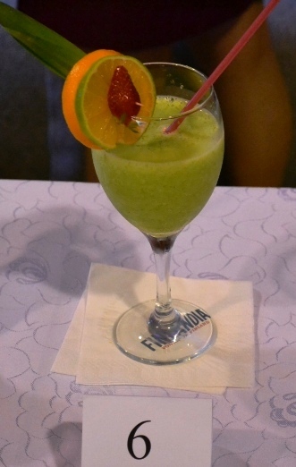Składniki: ananas, banan, syrop kokosowy, bazylia, sok pomarańczowy. Technika miksowania: blenderowanie. Naczynie: goblet – szkło barmańskie. Dekoracja: kompozycja z owoców na brzegu gobletu (listek ananasa, plaster pomarańczy, plaster limonki, ¼ truskawki), owocowy szaszłyk: drążone ananasy i plasterki truskawki.
