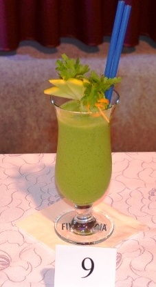 Składniki: natka pietruszki, cytryna, sok pomarańczowy, cukier, syrop curacao. Technika miksowania: blenderowanie. Naczynie: szklanica barmańska. Dekoracja: ananas, miechunka, jabłko, cytryna, wykałaczka.
