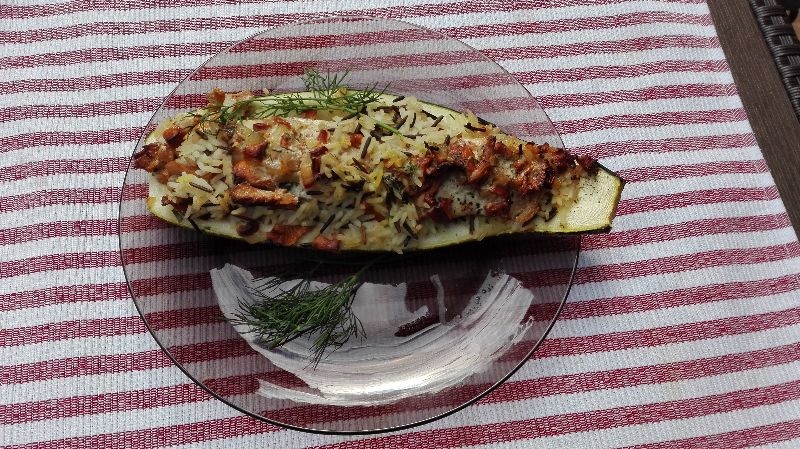 Dno żaroodpornych naczyń lekko zwilżam (tu chyba przeprosiny zbędne bo…) olejem i układam połówki cukinii, w nie układam cienką warstewkę ryżu, a na niego ścisło filety dorsza. Jak przy ściankach cukinii są luki, to wypełniam je ryżem. Filety przykrywam kurkami z patelni z sosem i całość wstawiam do piekarnika na ok. 40 minut. Sprawdzam po 30 minutach, czy nic się nie przypala, a cukinie są miękkie, jak tak, to można wyjąć wcześniej. Po wyjęciu całość można jeszcze posypać koperkiem i…