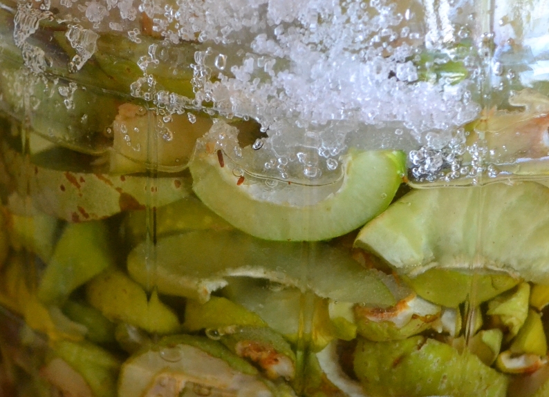 Owoce płuczemy w wodzie. Każdy owoc ćwiartujemy i wycinamy pestki i białe miejsca, które spowodowałyby, że syrop/dżem byłby gorzki. Tak pokrojone owoce układamy warstwami w słoiku, każdą warstwę zasypując cukrem.