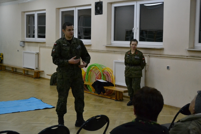 St. sierż. Józefowski mówi o tym szkoleniu: Dziś rozpoczęliśmy realizację programu, którego działania mają pomóc w stworzeniu sprawnego systemu Obrony Cywilnej. Zajęcia zaczęliśmy od pierwszej pomocy. Następnie przeszliśmy do dyskusji w temacie lokalnych zagrożeń jakie mogą wystąpić i ich zapobieganiu.