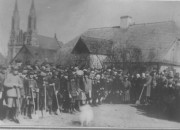 Święto sadzenia drzew w Sadownem w 1927 r. – dzieci szkolne przed budynkiem szkoły powszechnej (dawniej mieścił się w niej sąd gminny). Dom spłonął we wrześniu 1939 r.