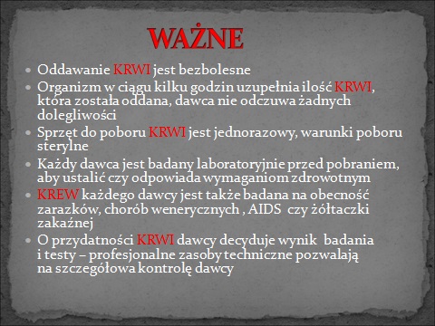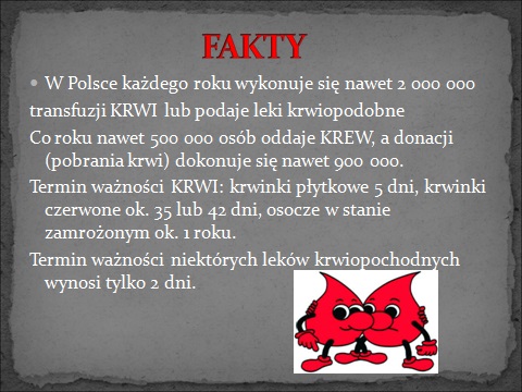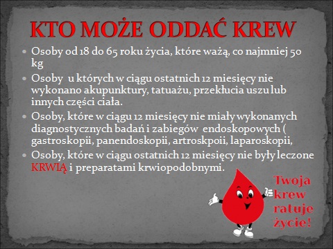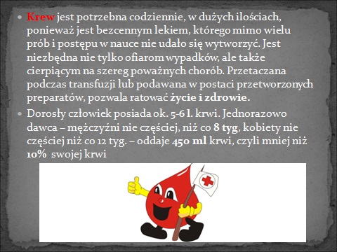 Jedno z takich zadań to propagowanie i szerzenie krwiodawstwa. Krew to jedyny w swoim rodzaju lek. W idei krwiodawstwa najwspanialsze jest to, że prawie każdy z nas może pomagać, przekazać coś bezcennego, nie ponosząc przy tym żadnych kosztów. Wręcz przeciwnie – są z tego same korzyści.