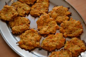 Cukinię i marchewkę zetrzeć na tarce o dużych oczkach, włożyć do miski. Dodać jajo, len mąkę, płatki i przyprawy – całość wymieszać. Nakładać masę na blachę wyłożoną papierem do pieczenia, formować placuszki. Piec ok. 15-20 minut w temp. 200 st. C.