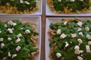 50 g makaronu pełnoziarnistego np. świderki, 50 g szpinaku (dwie garście), 1 ząbek czosnku, 25 g (2 ½ łyżki) nasion słonecznika, 1 łyżeczka oliwy z oliwek, szczypta soli morskiej