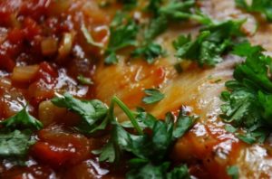 Filet umyć, posypać przyprawami i położyć na folię aluminiową. Pomidory pokroić w małe plasterki i położyć na rybie. Obłożyć plastrami sera. Piec w piekarniku nagrzanym do 175 st. C. Podawać z kapustą kiszoną przygotowaną z pokrojoną papryką i skropioną oliwą.