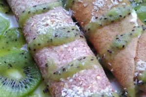 Mleko rozmieszać z jajkiem i mąką. Kiwi obrać, pokroić i zblendować wraz z ksylitolem. Naleśniki usmażyć na oleju rzepakowym. Posmarować je musem i zwinąć w rulon.