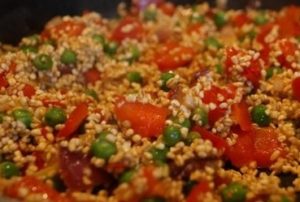 2 łyżki kaszy jaglanej (26 g), ćwiartka cebuli (27,5 g), ćwiartka papryki (57,5 g), 1 marchew (45 g), pół cukinii (100 g), 1 łyżka szczypiorku, pół łyżeczki masła ekstra (2,5 g), szczypta pieprzu czarnego, szczypta soli morskiej