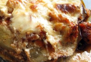 Bakłażana pokroić wzdłuż na plastry, posolić i odstawić na 15 minut. Odlać z niego sok i włożyć na 15 minut do piekarnika rozgrzanego do 180 st. C. Cebulę posiekać, podsmażyć na rozgrzanym oleju, dodać kurkumę, paprykę, garam masala i jeszcze chwilę smażyć. Dodać wypłukaną soczewicę, wlać pomidory. Dusić, aż soczewica będzie miękka. W razie potrzeby dodać trochę wody. Przyprawić sosem sojowym, solą, pieprzem i oregano. W naczyniu żaroodpornym umieścić na zmianę bakłażany i sos z soczewicy. Na wierzchu posypać płatkami drożdżowymi. Całość zapiec w piekarniku w 180 st. C przez 15 minut. Przed podaniem można udekorować zieleniną.