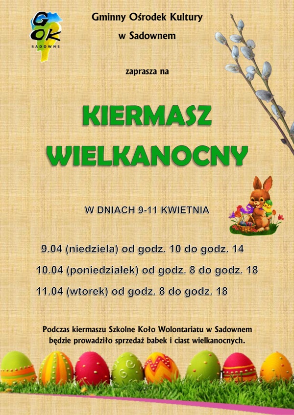 Gminny Ośrodek Kultury w Sadownem w dniach 9 – 11 kwietnia zaprasza na Kiermasz Wielkanocny.