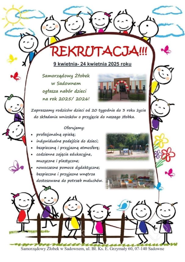 Dyrektor Samorządowego Żłobka w Sadownem zaprasza do składania Kart Zgłoszenia Dziecka do Samorządowego Żłobka w Sadownem.