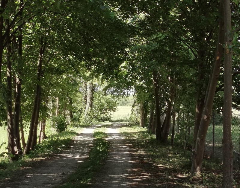 polem, łąką, rzeką, lasem.