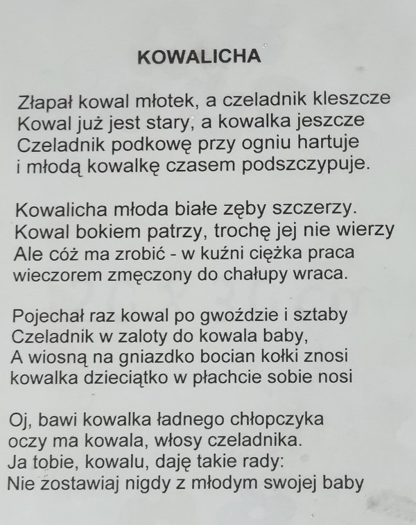 Wodzirej czyli p. Ewa Piórkowska powitała gości Młodego starą wiejską gwarą i zaprosiła do kuźni, czyli domu Młodego. Tam ojciec- kowal p. Edward Danaj pouczał syna Bartka Olajossego, jak ma zachowywać się w swoim małżeństwie, co go czeka, jak ciężko musi pracować na chleb, aby utrzymać rodzinę, no i oczywiście pobiadolił razem z matką Młodego p. Basią Zawadzką, jak to im będzie ciężko rozstawać się z ukochanym synem. Następnie kazał synowi przeczytać tekst słynnej ,,KOWALICHY’ i obowiązkowo stosować się do zalecenia zawartego w ostatnich słowach tekstu.