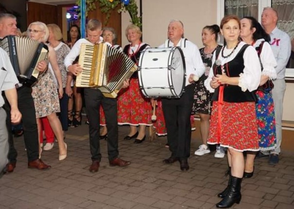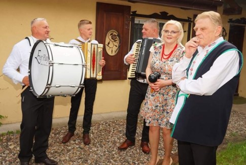 Następnie rodzice dali błogosławieństwo swojemu synowi i zaprosili wszystkich gości na poczęstunek i krótką zabawę przed wyjściem Młodego do Młodej. Okazjonalne przyśpiewki weselne oraz zabawę poprowadził Zespół Śpiewaczy Sadowianki.