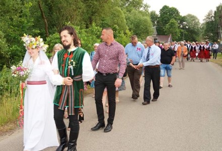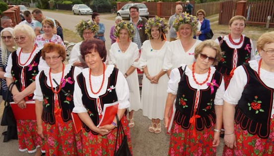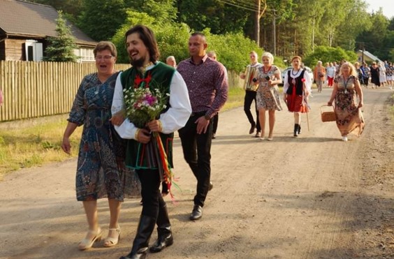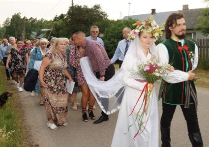 Żartobliwe przyśpiewki rozbawiły Młodych i wszystkich gości. Po udzieleniu Parze Młodej błogosławieństwa, weselne druhny przypięły Gościm wstążeczki z kwiatuszkami na znak uczestnictwa w weselu i znowu cały orszak ruszył w drogę wiodąca przez wieś aż do wiejskiej świetlicy.