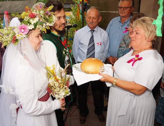 Orszak weselny zatrzymał się przed świetlicą, gdzie czekał Naczelnik Wsi Krupińskie i nakazał Młodym ku uciesze zebranych złożyć komiczną przysięgę małżeńską. Następnie rodzice przywitali Młodą Parę chlebem i solą. A żeby tradycji stało się zadość, Młody przeniósł wybrankę przez próg.