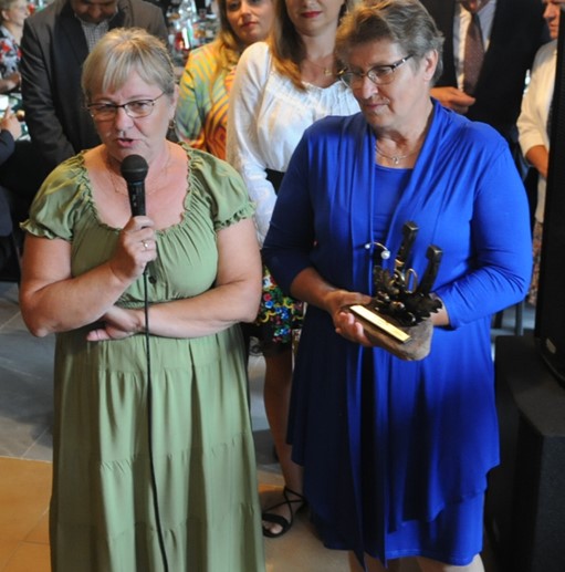 Przedstawicielki Koła Gospodyń Wiejskich ,,ZŁOTA RÓŻA” w Krupińkiem, dwie Barbary Laska i Zawadzka, wręczają SADOWIANKOM rękodzieło artystyczne wykonane zdolną ręką mistrza kowala Edwarda Danaja w jego pracowni Kuźni w Krupińskiem