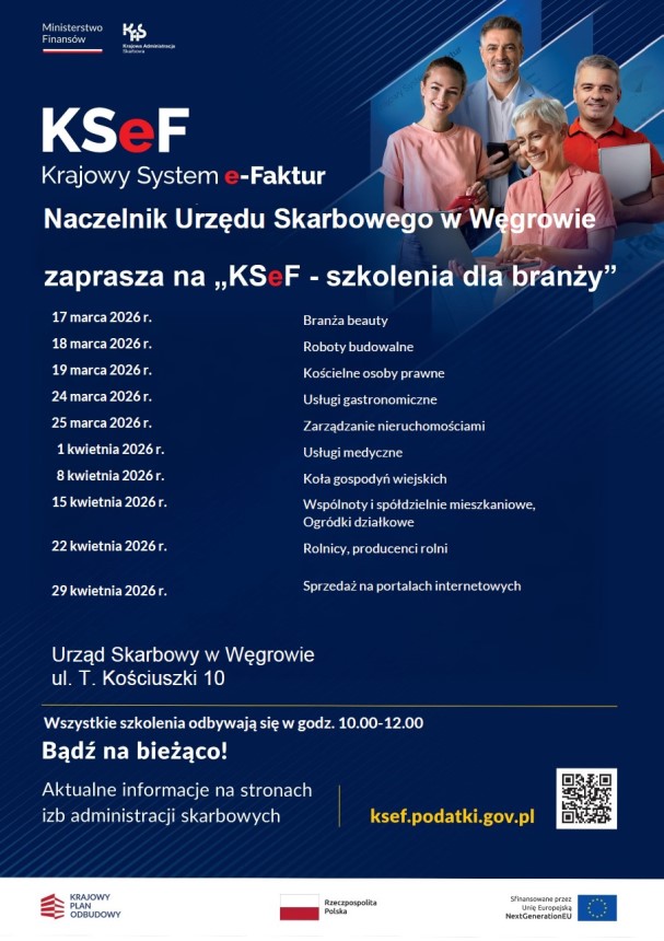 Naczelnik Urzędu Skarbowego w Węgrowie zaprasza na szkolenia branżowe dotyczące Krajowego Systemu e-Faktur dla przedsiębiorców.