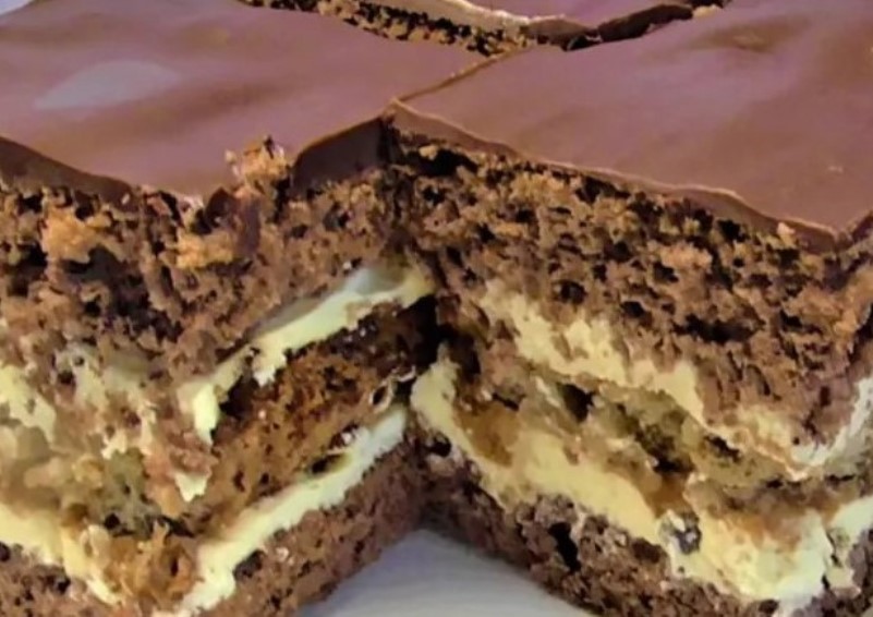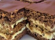 Ciasto I: białka ubij na sztywno, dodaj cukier, żółtka, kakao, proszek z mąką, cały czas ubijając. Piecz 30-40 minut w temp. 180 st. C. Ostudź, przekrój wzdłuż na pół.