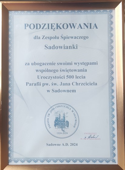 Zespół Śpiewaczy „Sadowianki” otrzymał od ks. proboszcza osobiste zaproszenie na tę piękną uroczystość, aby jako gospodarze otworzyć część artystyczną i zaprosić przybyłych gości do wspólnego świętowania.