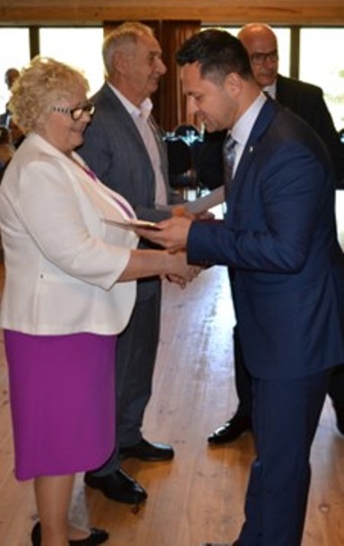 Tam, w imieniu Prezydenta RP Andrzeja Dudy, medale małżonkom wręczył Wójt Gminy Sadowne p. Waldemar Cyran w asyście małżonki p. Katarzyny Cyran, Zastępcy Wójta Gminy Sadowne p. Marcina Grędy, Przewodniczącego Rady Gminy Sadowne p. Tomasza Szymanika i Kierownik Urzędu Stanu Cywilnego w Sadownem p. Renaty Urbankowskiej.