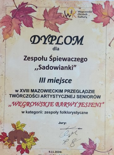 Gala Finałowa „Węgrowskich Barw Jesieni” odbyła się 9 listopada 2024 roku w Węgrowskim Ośrodku Kultury, a tam dowiedzieliśmy się, że zdobyliśmy trzecie miejsce w kategorii Zespoły Folklorystyczne.