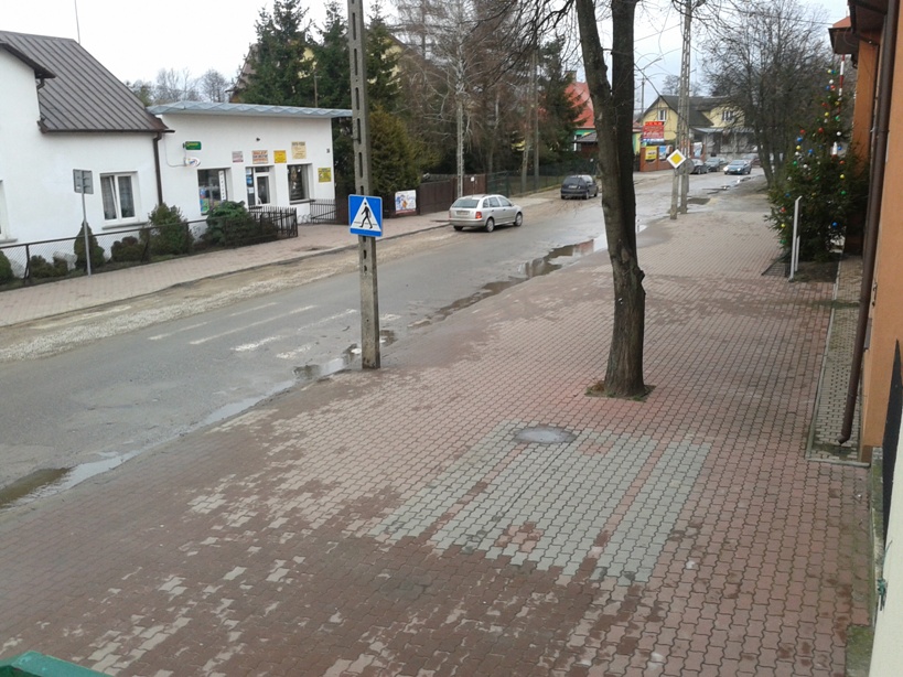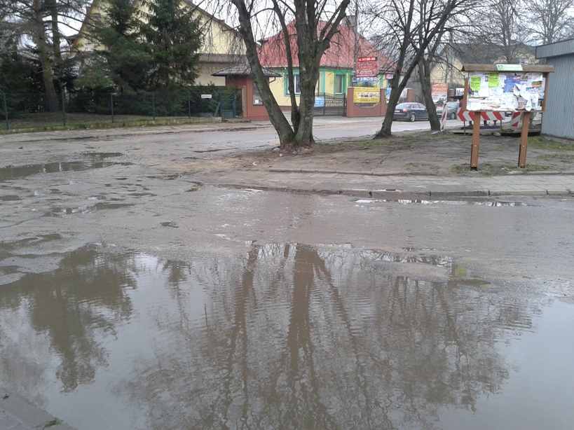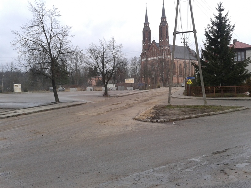 Podobna sytuacja ma miejsce na ul. Kościuszki i Placu Kościelnym. Podczas jazdy trzeba uważać na uskoki w jezdni i leżące kawałki asfaltu oraz żwiru – padający deszcz rozmywa piaszczyste pokrycie ubytków drogi i tworzy się błoto.