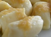 Do twarogu wbijamy jajka, dodajemy sól, cukier, wsypujemy mąkę i tłuczkiem do ziemniaków rozgniatamy do chwili uzyskania jednolitej gładkiej masy. Łyżką umoczoną w zimnej wodzie nabieramy niewielkie porcje ciasta twarogowego i wrzucamy na osolony wrzątek. Po wypłynięciu na powierzchnię kluski gotujemy jeszcze ok. 4 minuty. Wyjmujemy łyżką cedzakową, osączamy i wykładamy na półmisek.