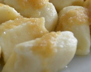 Masło roztapiamy, wsypujemy bułkę tartą, dodajemy ewentualnie cukier i cały czas mieszając chwilę podgrzewamy do napęcznienia tartej bułki. Polewamy nim ciepłe jeszcze kluski.