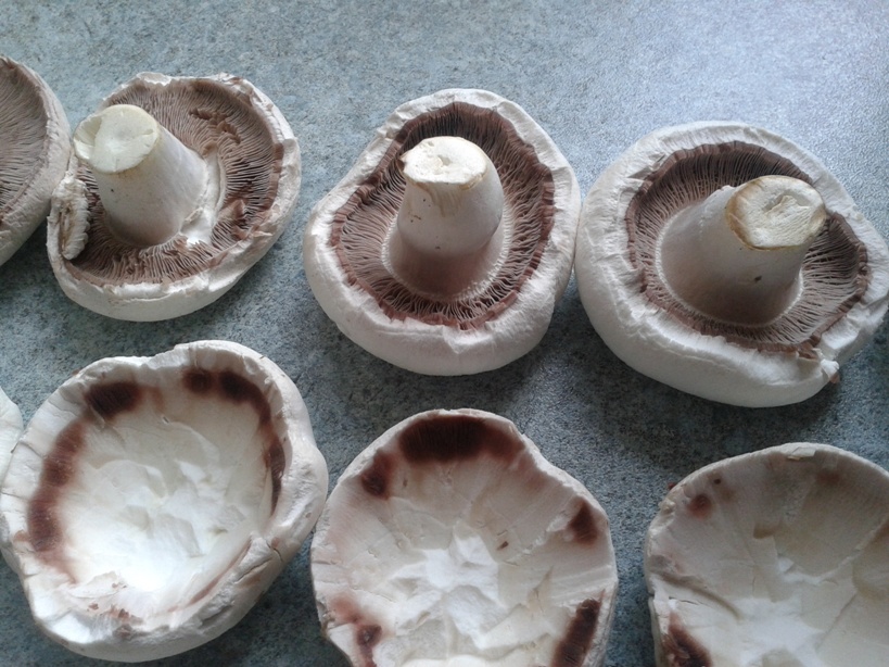 – pieczarki oczyścić, usunąć skórkę z kapeluszy, odciąć trzony, nożykiem lub łyżeczką wydrążyć spodnią część kapeluszy, usuwając blaszki i cienką warstewkę kapelusza. Pieczarki ułożyć na stolnicy wydrążonymi otworami do góry i lekko posolić,