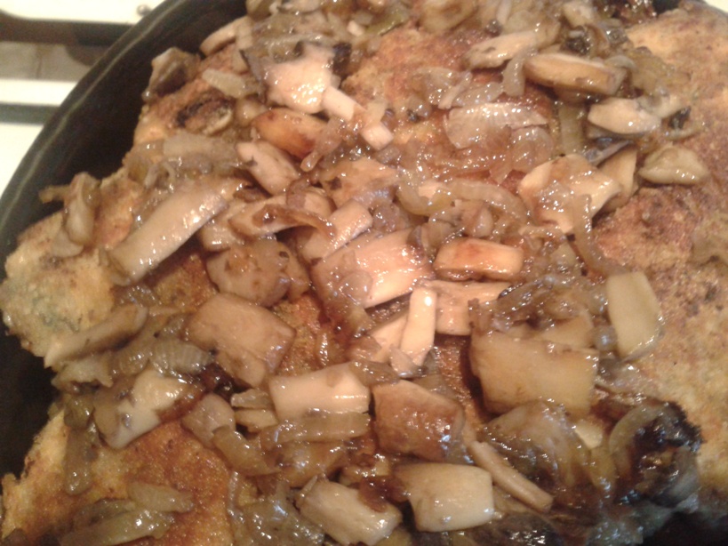 – usmażone pieczarki ułożyć w rondlu. Odcięte wcześniej trzony pieczarek przekrawać wzdłuż na ćwiartki i zesmażyć na patelni razem z jedną cebulą pokrojoną w ćwiartki i cienkie paski, a następnie posypać tą mieszanką pieczarki. Do rondla dolać minimalną ilość oleju i podgrzewać na ogniu do czasu, gdy usłyszymy skwierczenie rozgrzanego tłuszczu. Dolać wówczas niewielką ilość wody, przykryć pokrywą rondel i na minimalnym ogniu dusić potrawę ok. 15 – 20 minut.