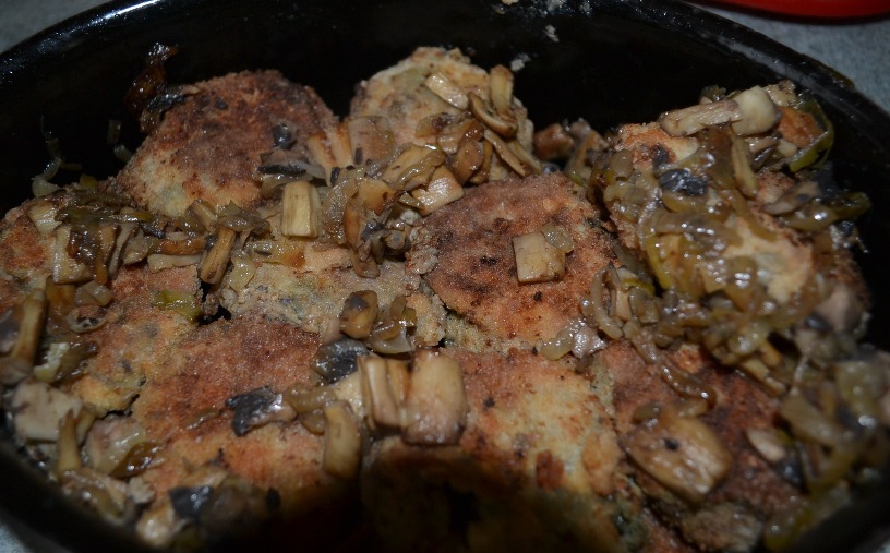 – tak przygotowanym nadzieniem napełniać wydrążone pieczarki, które następnie obtaczać w mące, jajku i bułce tartej (jak to się robi przy kotletach schabowych) i smażyć na gorącym oleju z dwóch stron na złoty kolor,