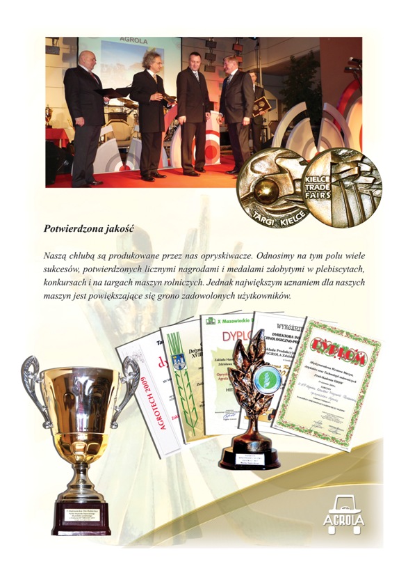 Dowiadujemy się także, że duża gama modeli produkowanego przez Agrolę sprzętu i możliwość dostosowania go do indywidualnych potrzeb użytkownika sprawiają, iż nawet najbardziej wymagający rolnicy, czy sadownicy, znajdują w jej ofercie spełniające ich wymagania maszyny. Świadczyć o tym może stale powiększające się grono klientów firmy zarówno w kraju, jak i poza jego granicami, a także uzyskiwane nagrody na międzynarodowych wystawach i targach.